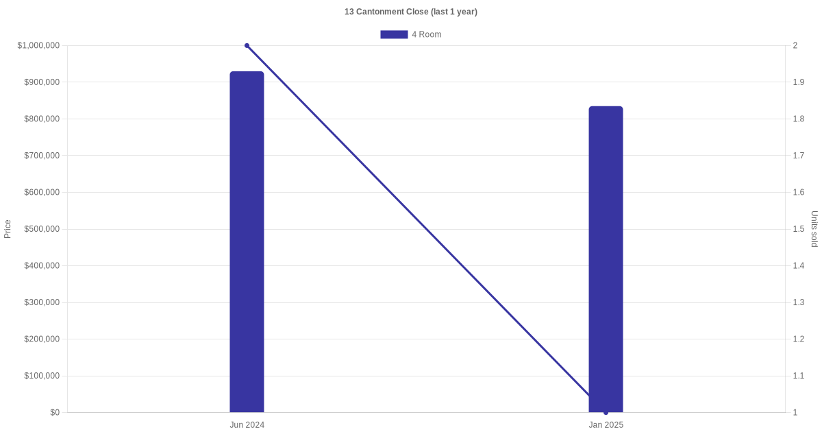 Below is a quick summary of the resale transactions volume and average price trends for the 3 room and 4 room units at 13 Cantonment Close.
