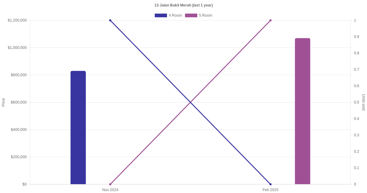Below is a quick summary of the resale transactions volume and average price trends for the 4 room and 5 room units at 13 Jalan Bukit Merah.