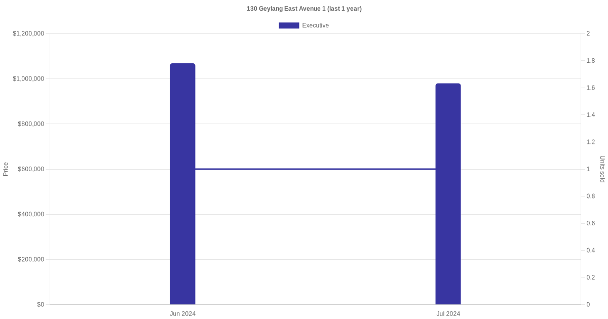 Below is a quick summary of the resale transactions volume and average price trends for the executive units at 130 Geylang East Avenue 1.