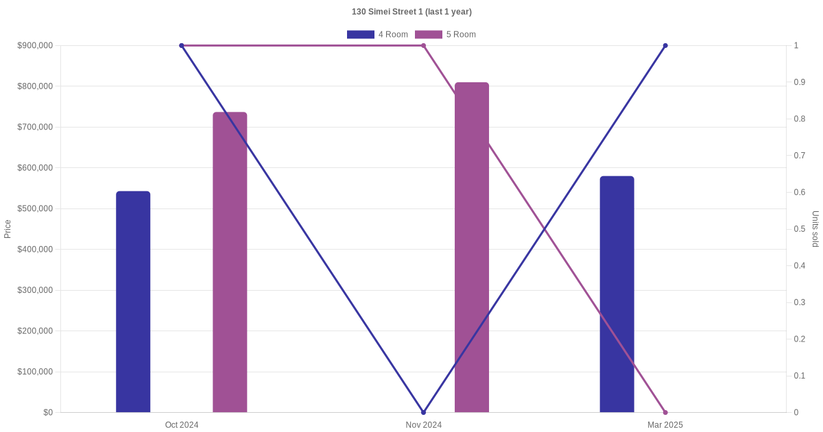 Below is a quick summary of the resale transactions volume and average price trends for the 4 room and 5 room units at 130 Simei Street 1.