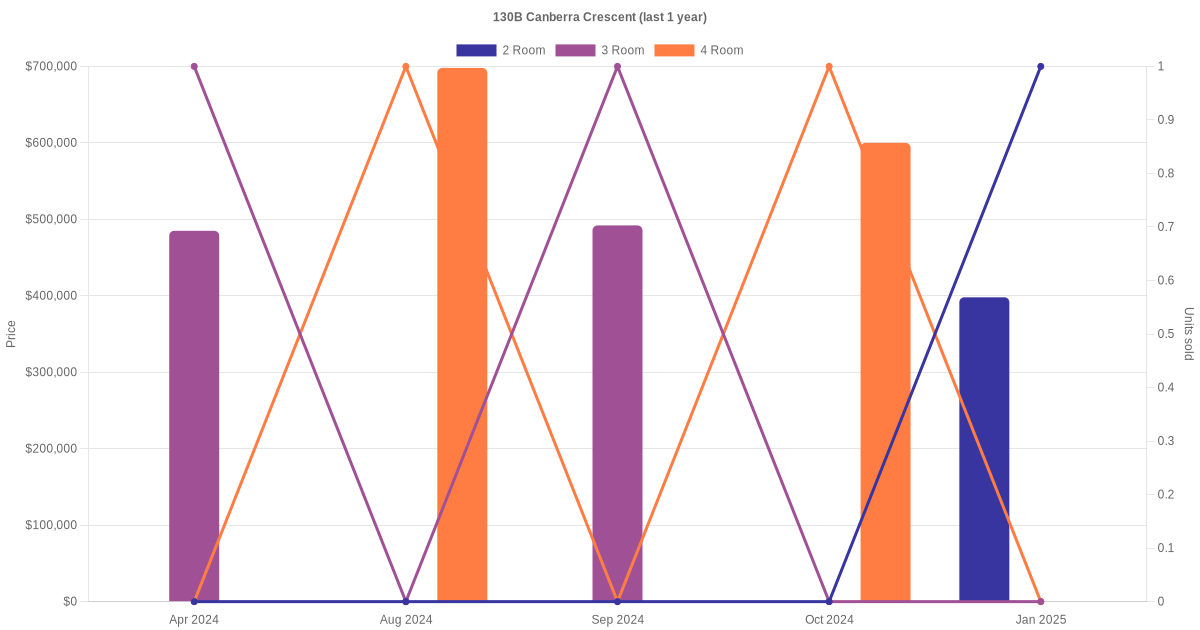 Here's a summary of the rental transactions and price trends for the 2 room, 3 room and 4 room units at 130B Canberra Crescent.