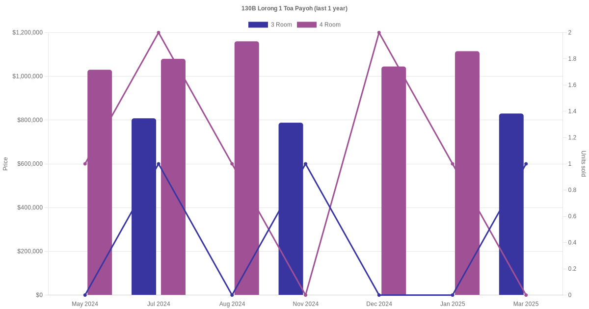 Below is a quick summary of the resale transactions volume and average price trends for the 3 room and 4 room units at 130B Lorong 1 Toa Payoh.