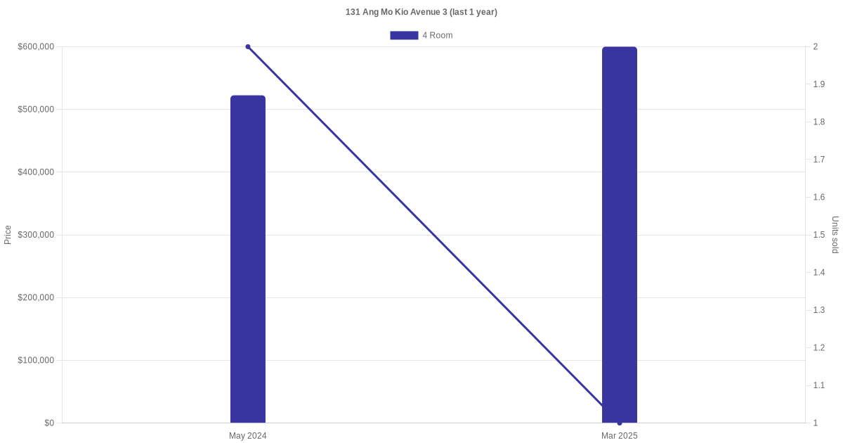 | Feb 2025 | $3,400 | 4 Room | Blk 131 Ang Mo Kio Avenue 3 4 Room | Ang Mo Kio |