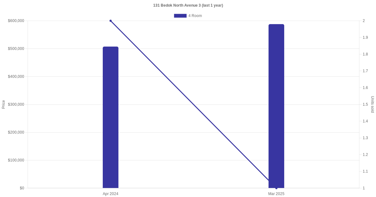 There were a total of 4 resale transactions in the last 3 years for units in block 131 Bedok North Avenue 3, with the latest one recorded in Mar 2025.
