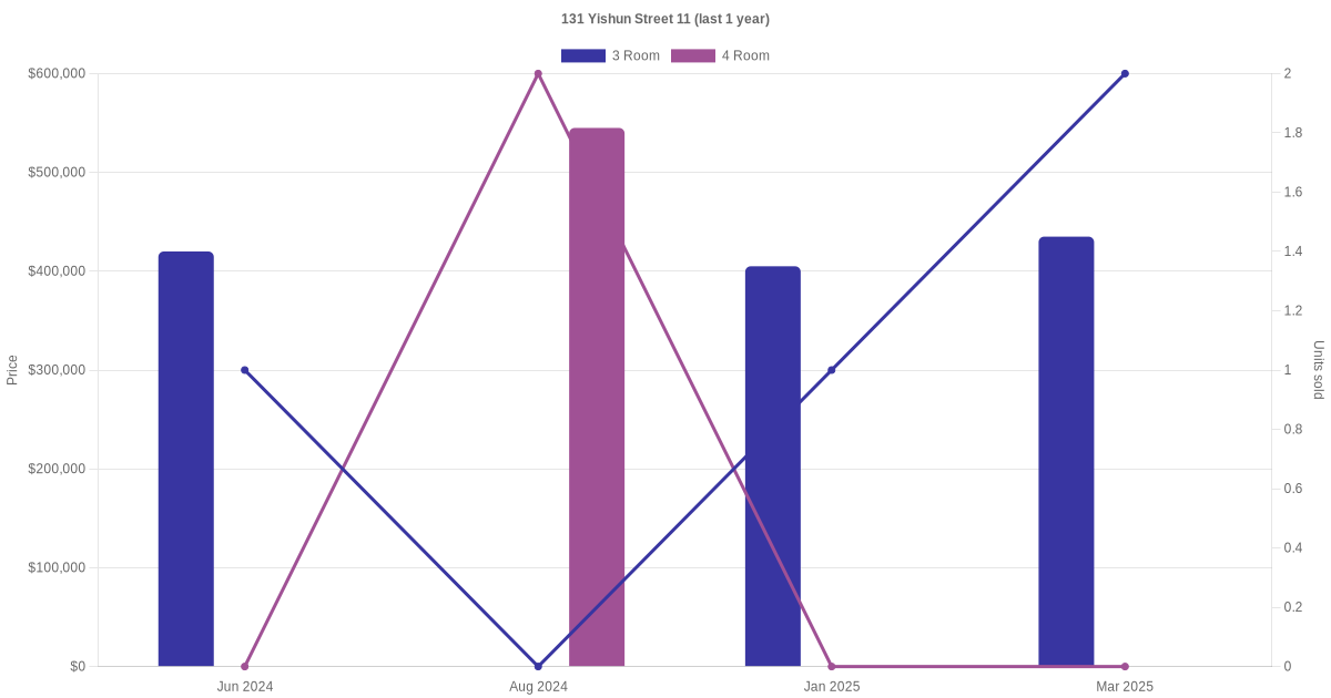 Below is a quick summary of the resale transactions volume and average price trends for the 3 room and 4 room units at 131 Yishun Street 11.