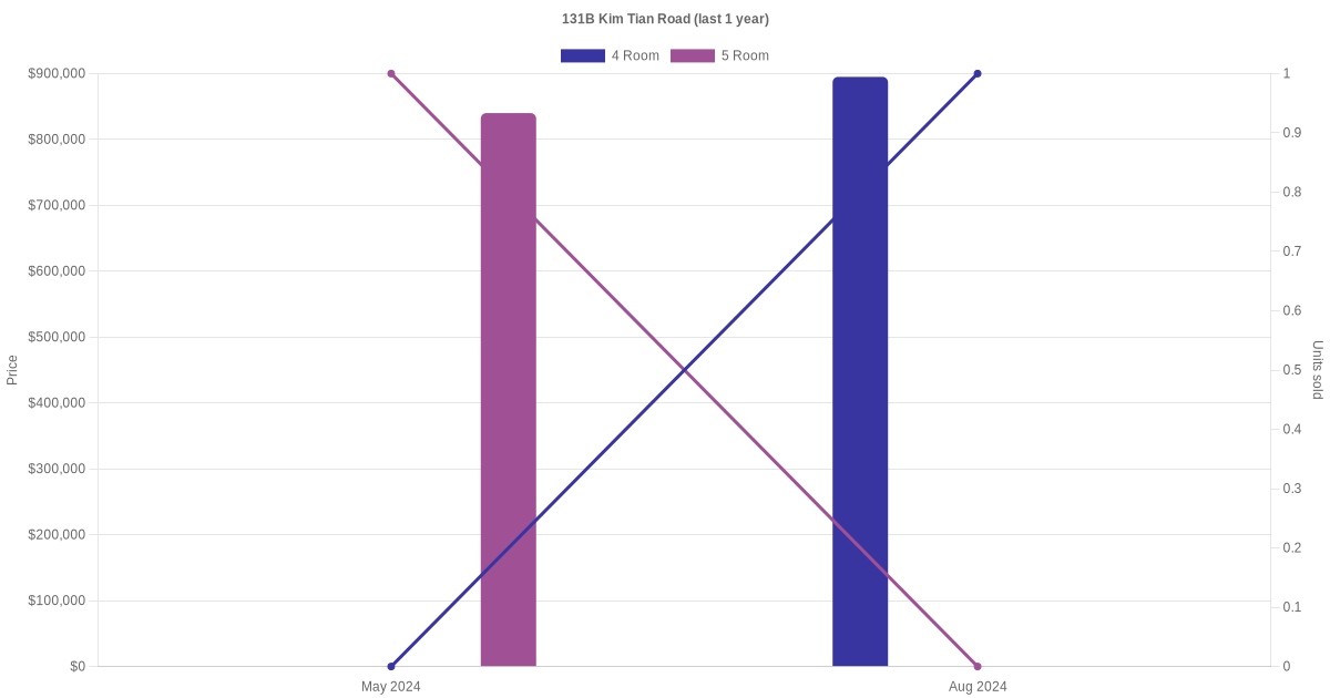 Below is a quick summary of the resale transactions volume and average price trends for the 4 room and 5 room units at 131B Kim Tian Road.
