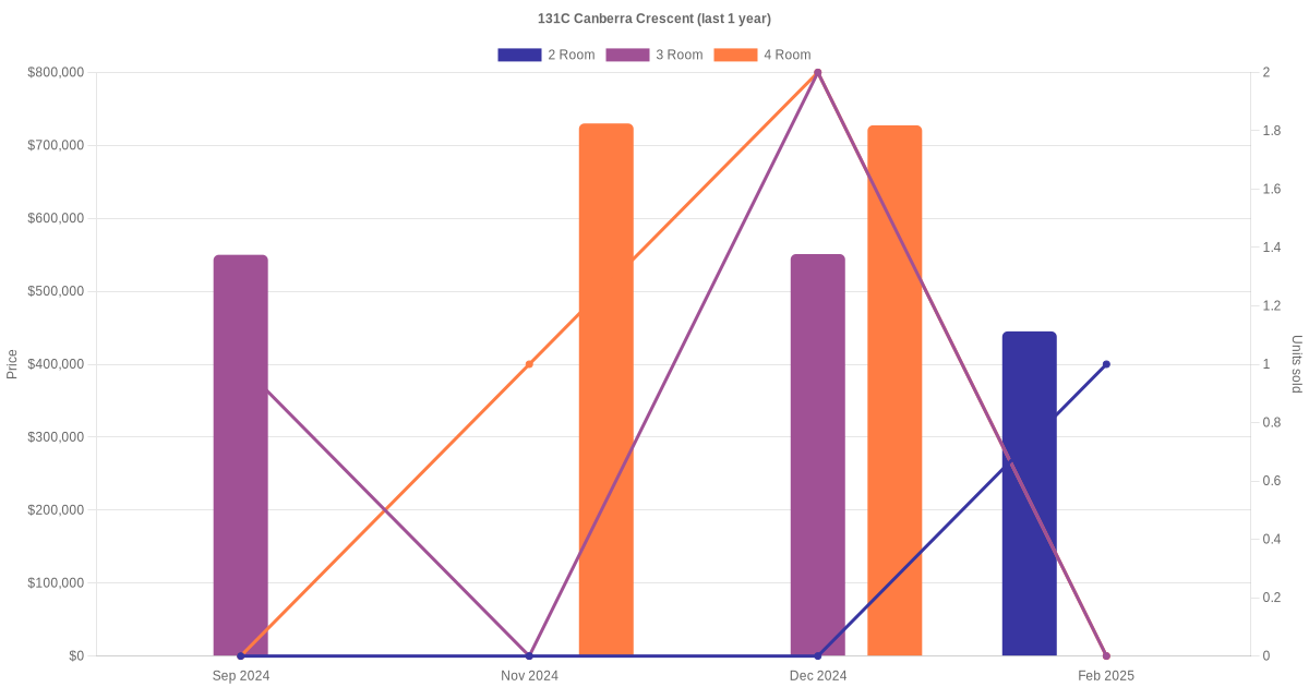 Here's a summary of the rental transactions and price trends for the 2 room, 3 room and 4 room units at 131C Canberra Crescent.