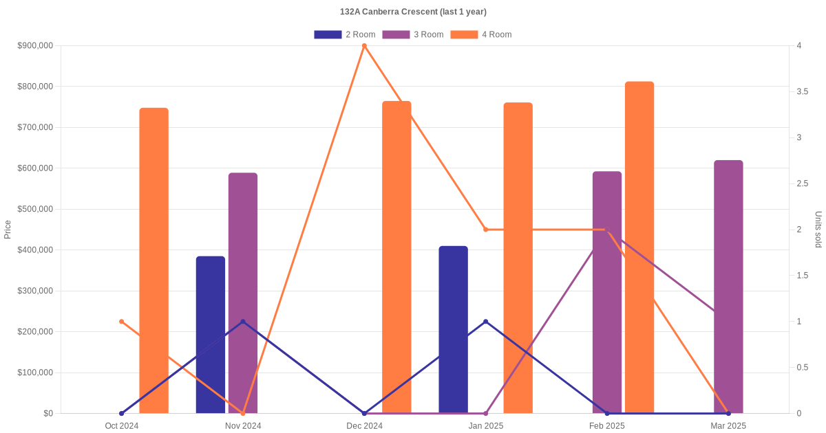 Here's a summary of the rental transactions and price trends for the 2 room, 3 room and 4 room units at 132A Canberra Crescent.