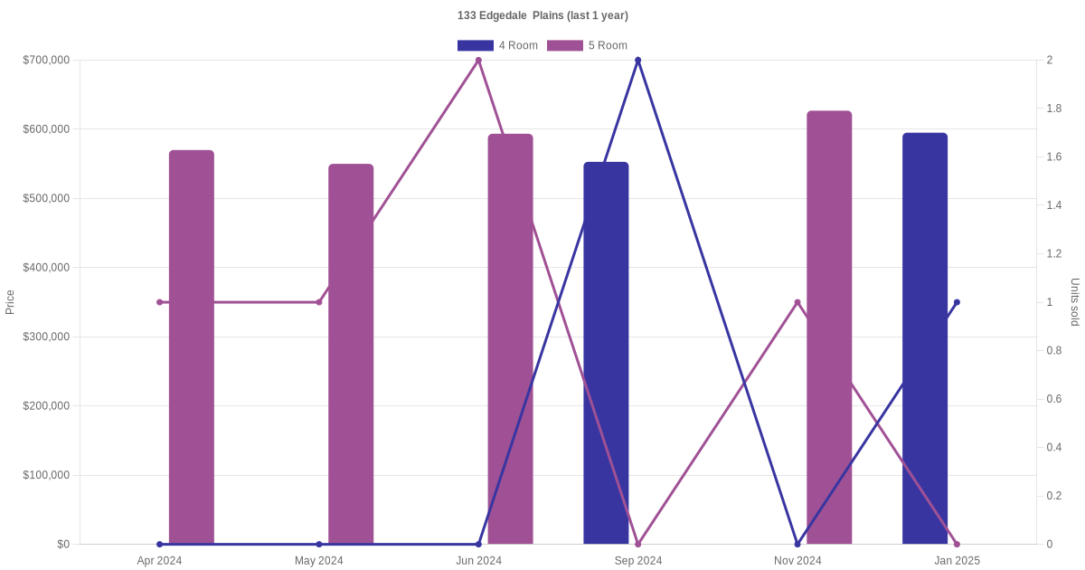 Below is a quick summary of the resale transactions volume and average price trends for the 4 room and 5 room units at 133 Edgedale Plains.