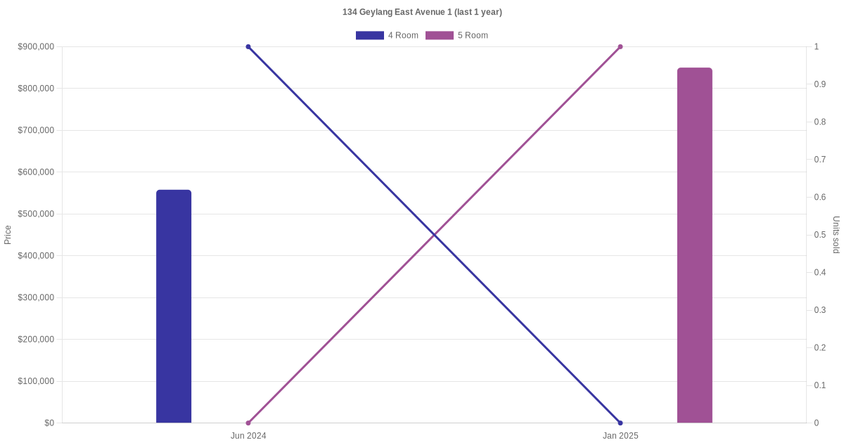 Below is a quick summary of the resale transactions volume and average price trends for the 4 room and 5 room units at 134 Geylang East Avenue 1.