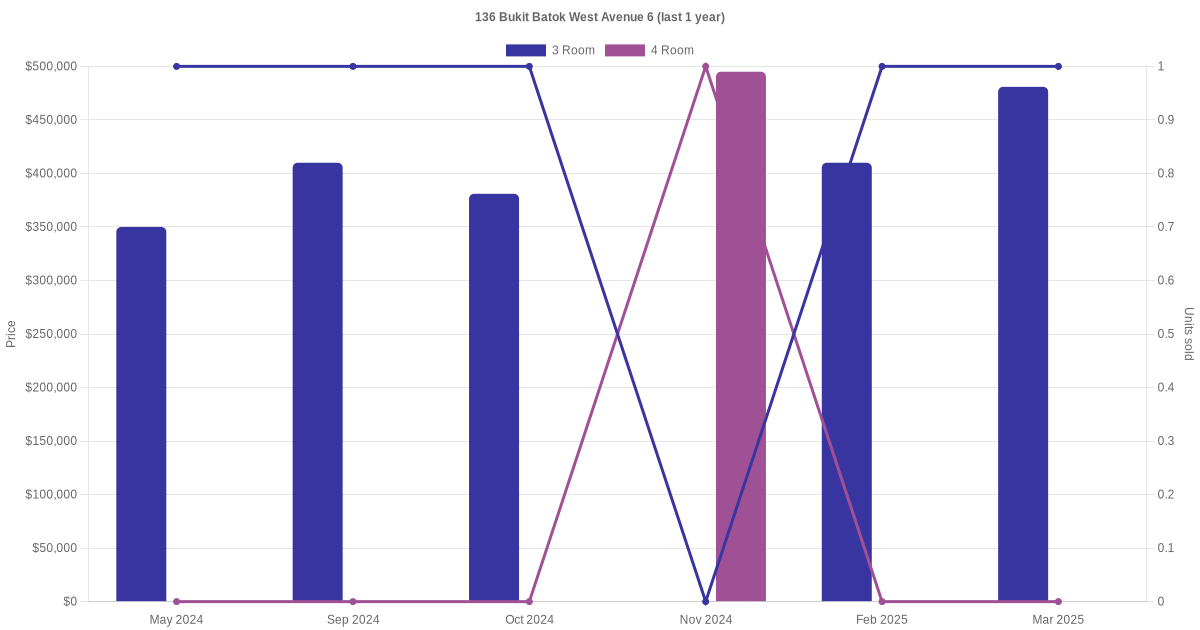 Below is a quick summary of the resale transactions volume and average price trends for the 3 room and 4 room units at 136 Bukit Batok West Avenue 6.
