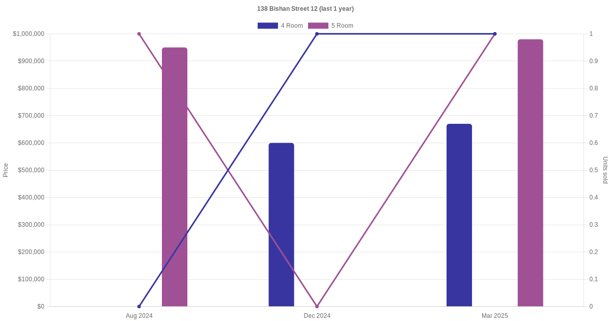 Below is a quick summary of the resale transactions volume and average price trends for the 4 room and 5 room units at 138 Bishan Street 12.