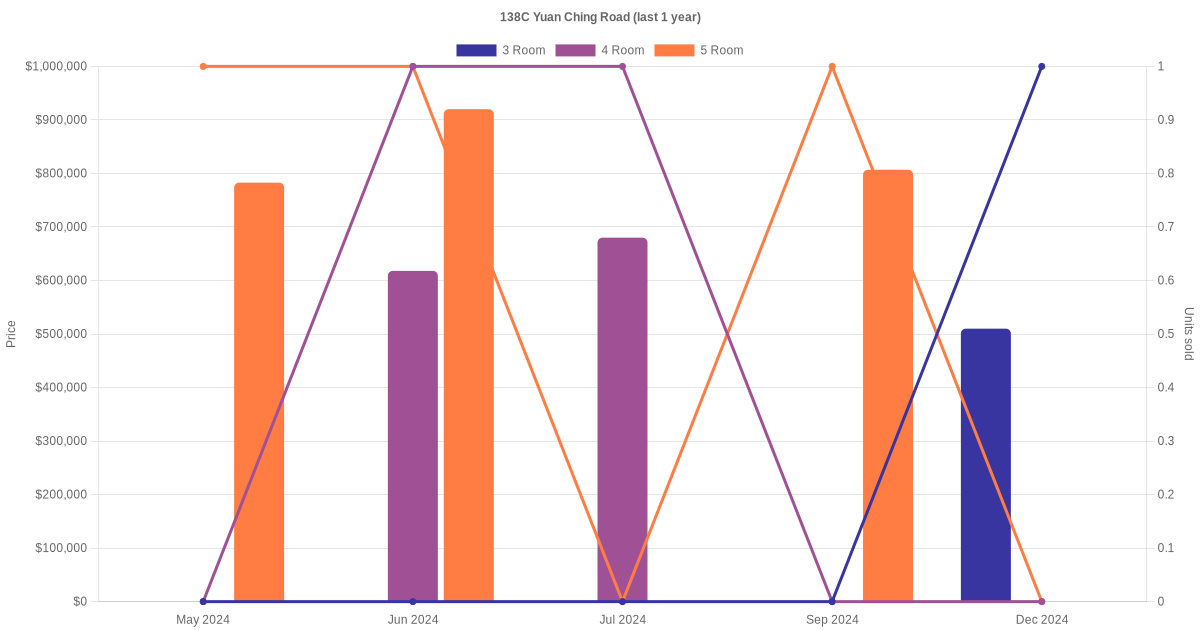 Below is a quick summary of the resale transactions volume and average price trends for the 3 room, 4 room and 5 room units at 138C Yuan Ching Road.