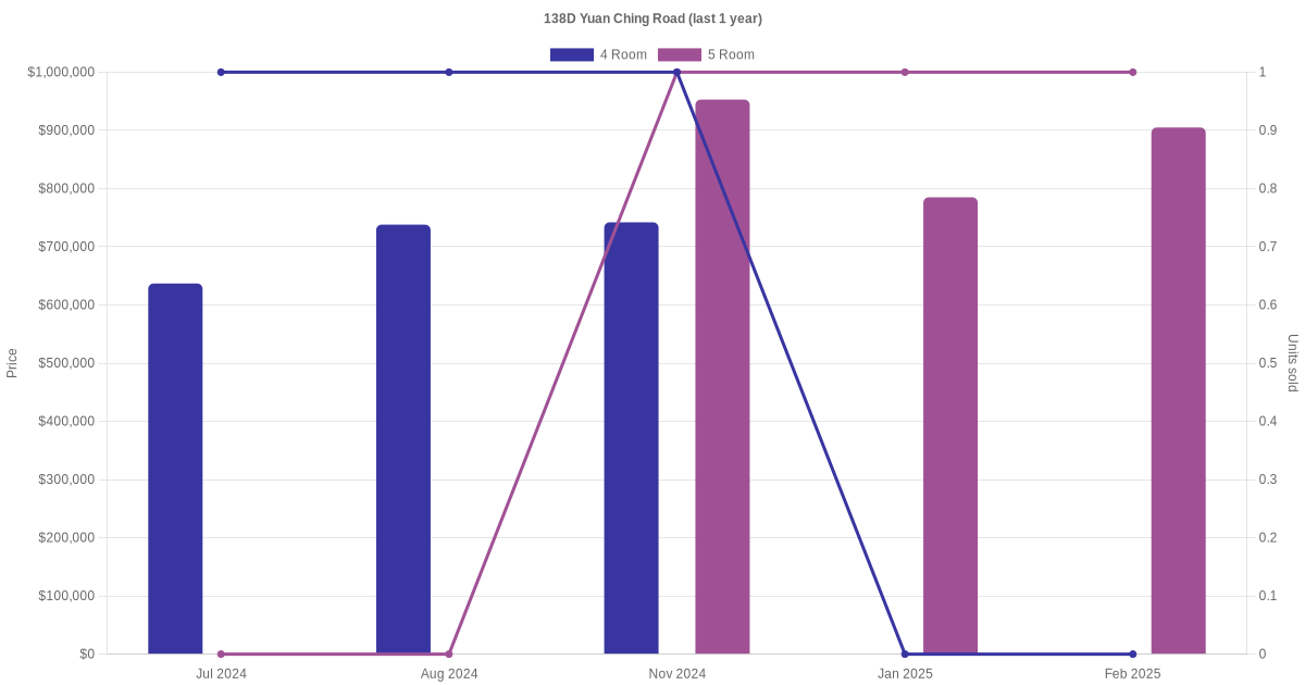 Below is a quick summary of the resale transactions volume and average price trends for the 3 room, 4 room and 5 room units at 138D Yuan Ching Road.