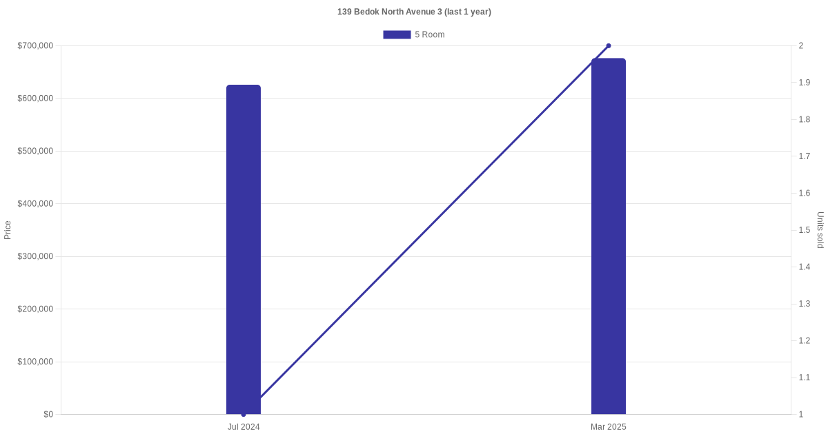 | Mar 2025 | $678,000 | $5,795 | 5 Room | Blk 139 Bedok North Avenue 3 5 Room / 117 sqm | 10 to 12 | 117 sqm | Standard | 1979 |