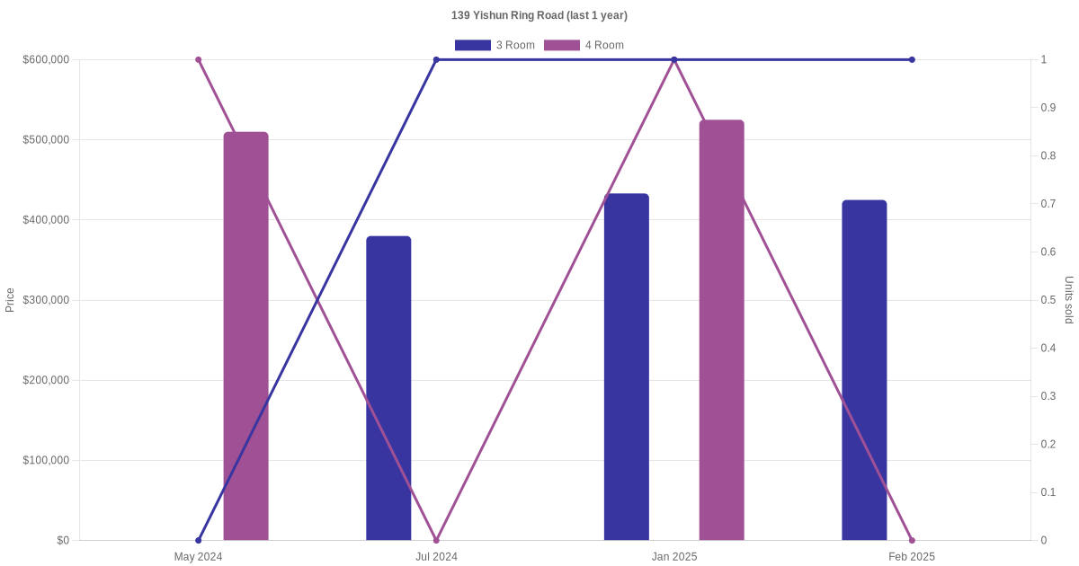 Below is a quick summary of the resale transactions volume and average price trends for the 3 room and 4 room units at 139 Yishun Ring Road.