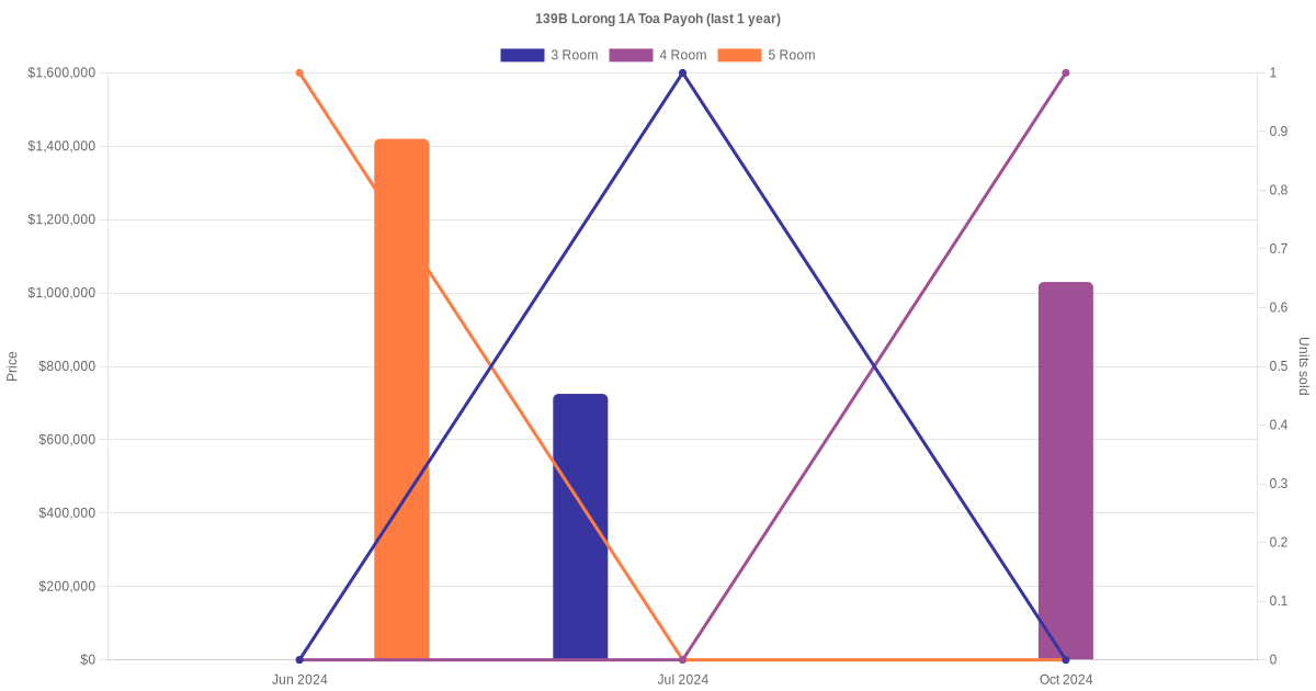 Below is a quick summary of the resale transactions volume and average price trends for the 3 room, 4 room and 5 room units at 139B Lorong 1A Toa Payoh.