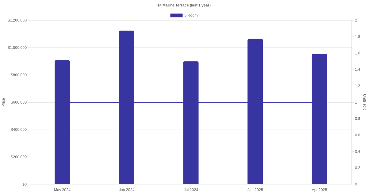 Below is a quick summary of the resale transactions volume and average price trends for the 5 room units at 14 Marine Terrace.