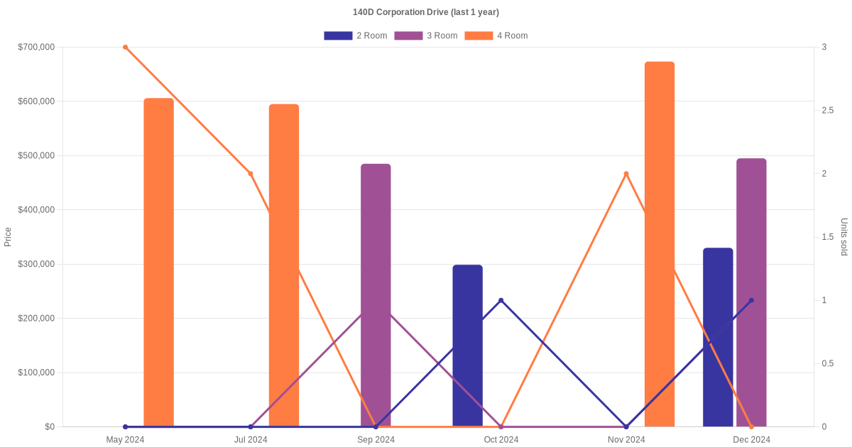 Here's a summary of the rental transactions and price trends for the 2 room, 3 room and 4 room units at 140D Corporation Drive.