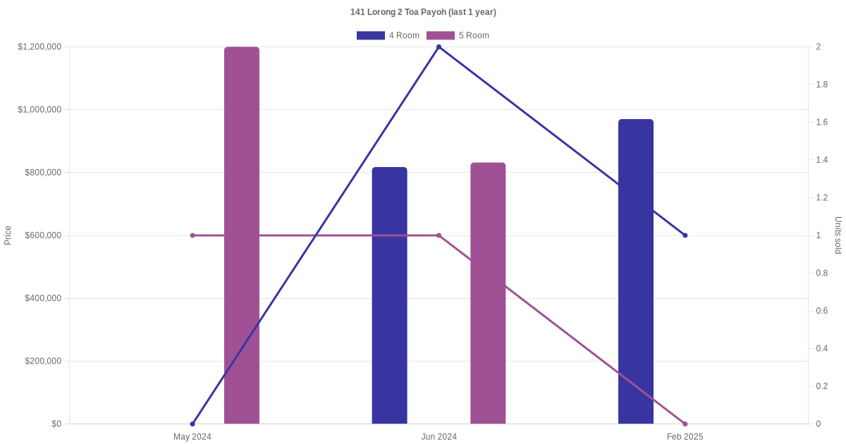 Below is a quick summary of the resale transactions volume and average price trends for the 4 room and 5 room units at 141 Lorong 2 Toa Payoh.
