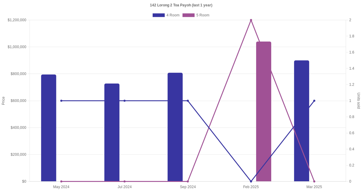 Below is a quick summary of the resale transactions volume and average price trends for the 4 room and 5 room units at 142 Lorong 2 Toa Payoh.