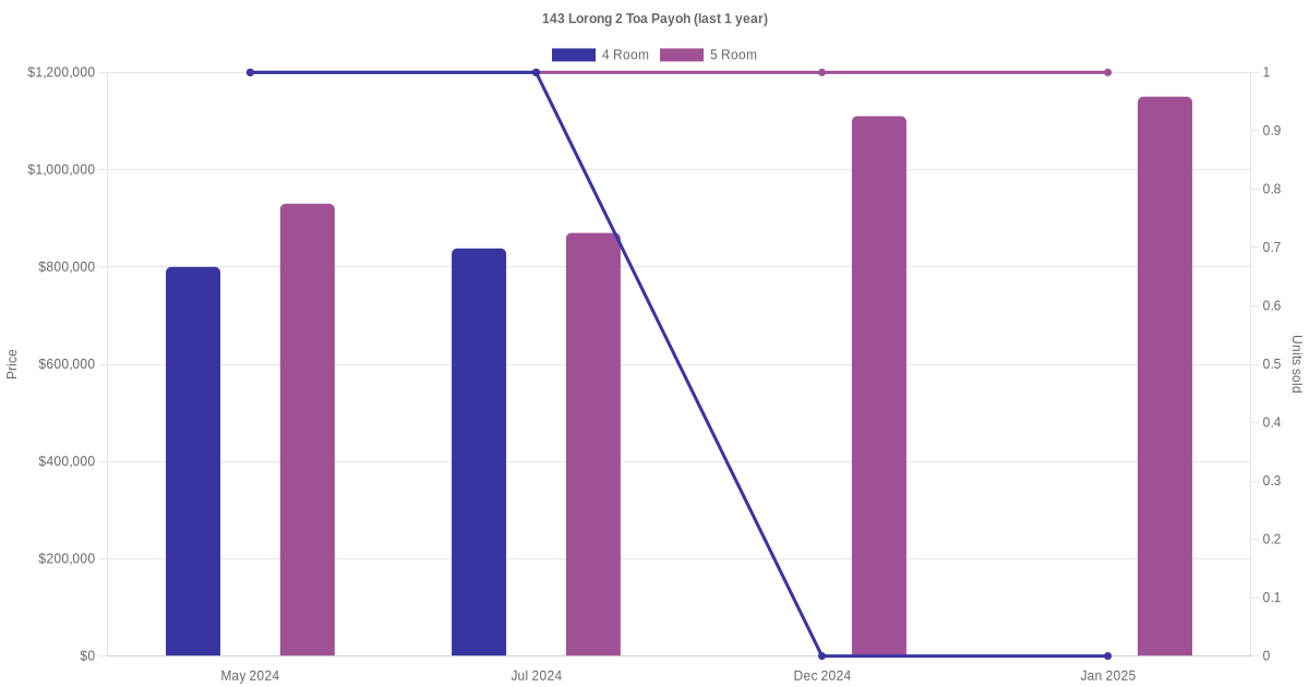 Below is a quick summary of the resale transactions volume and average price trends for the 4 room and 5 room units at 143 Lorong 2 Toa Payoh.