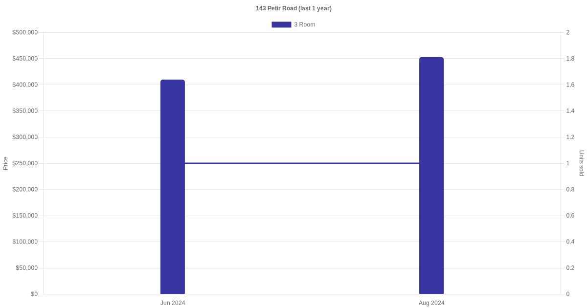 Below is a quick summary of the resale transactions volume and average price trends for the 3 room and 4 room units at 143 Petir Road.