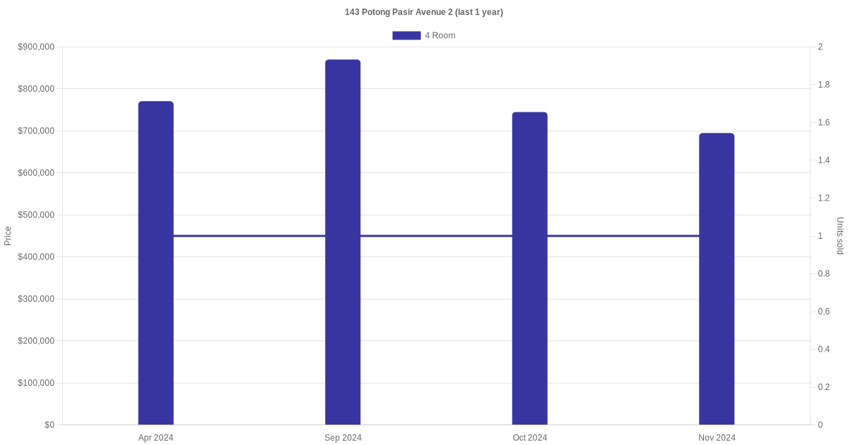 | Nov 2024 | $695,000 | $6,683 | 4 Room | Blk 143 Potong Pasir Avenue 2 4 Room / 104 sqm | 01 to 03 | 104 sqm | Model A | 1984 |
