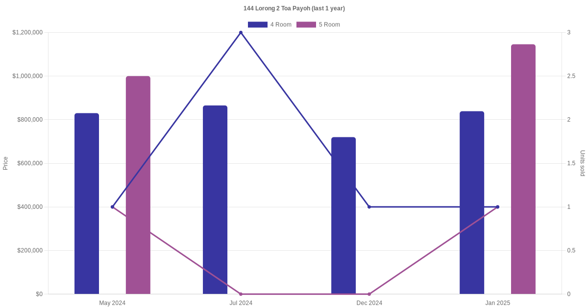 Below is a quick summary of the resale transactions volume and average price trends for the 4 room and 5 room units at 144 Lorong 2 Toa Payoh.