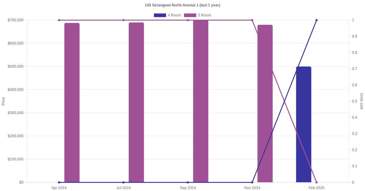 Below is a quick summary of the resale transactions volume and average price trends for the 4 room and 5 room units at 145 Serangoon North Avenue 1.