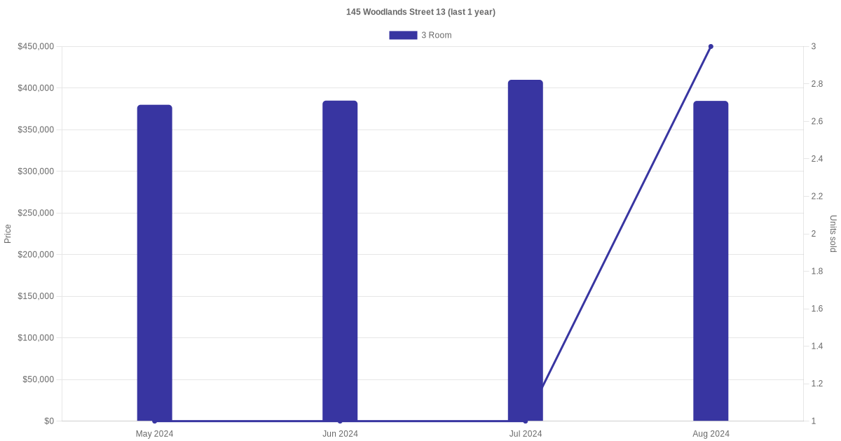 Below is a quick summary of the resale transactions volume and average price trends for the 3 room and 4 room units at 145 Woodlands Street 13.