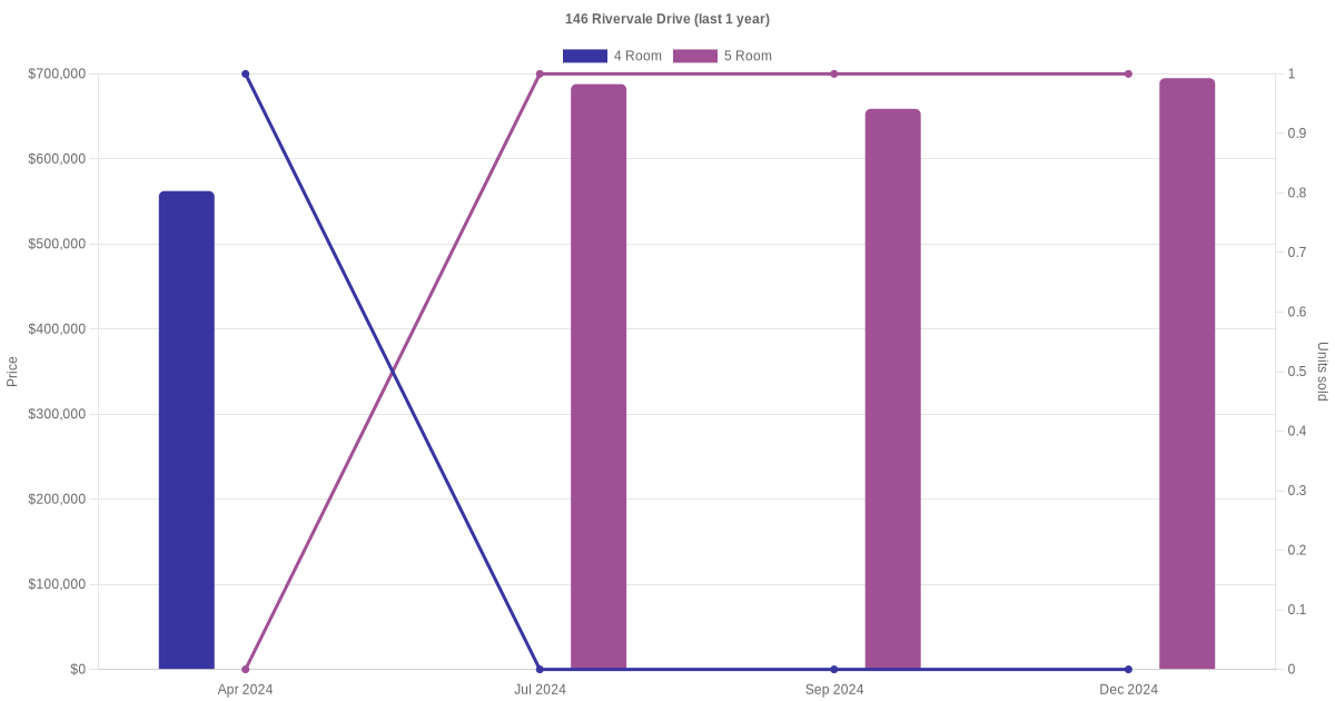 Below is a quick summary of the resale transactions volume and average price trends for the 4 room and 5 room units at 146 Rivervale Drive.