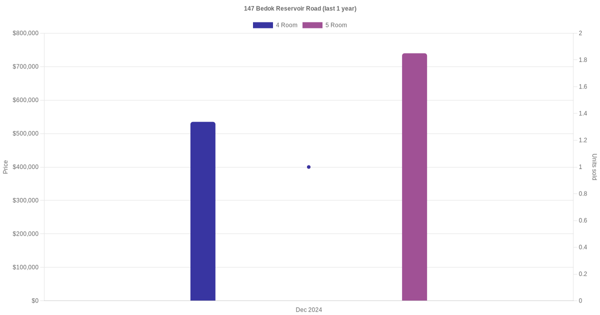 Below is a quick summary of the resale transactions volume and average price trends for the 4 room and 5 room units at 147 Bedok Reservoir Road.