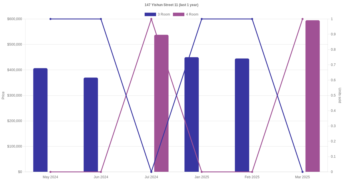 Below is a quick summary of the resale transactions volume and average price trends for the 3 room and 4 room units at 147 Yishun Street 11.