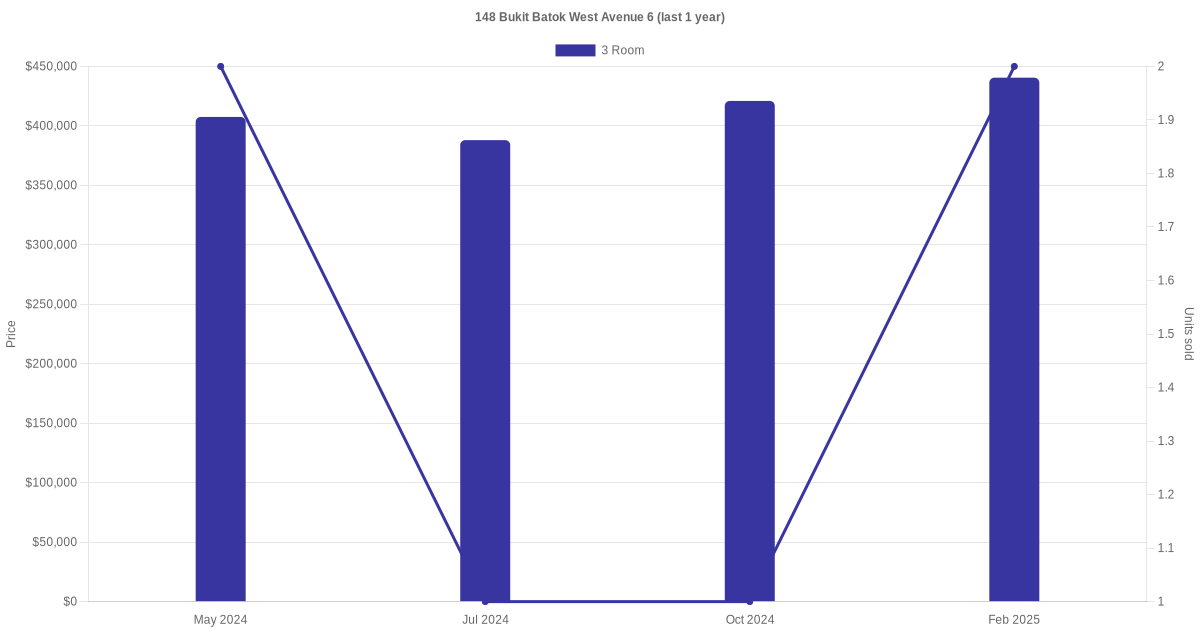 Below is a quick summary of the resale transactions volume and average price trends for the 3 room and 4 room units at 148 Bukit Batok West Avenue 6.