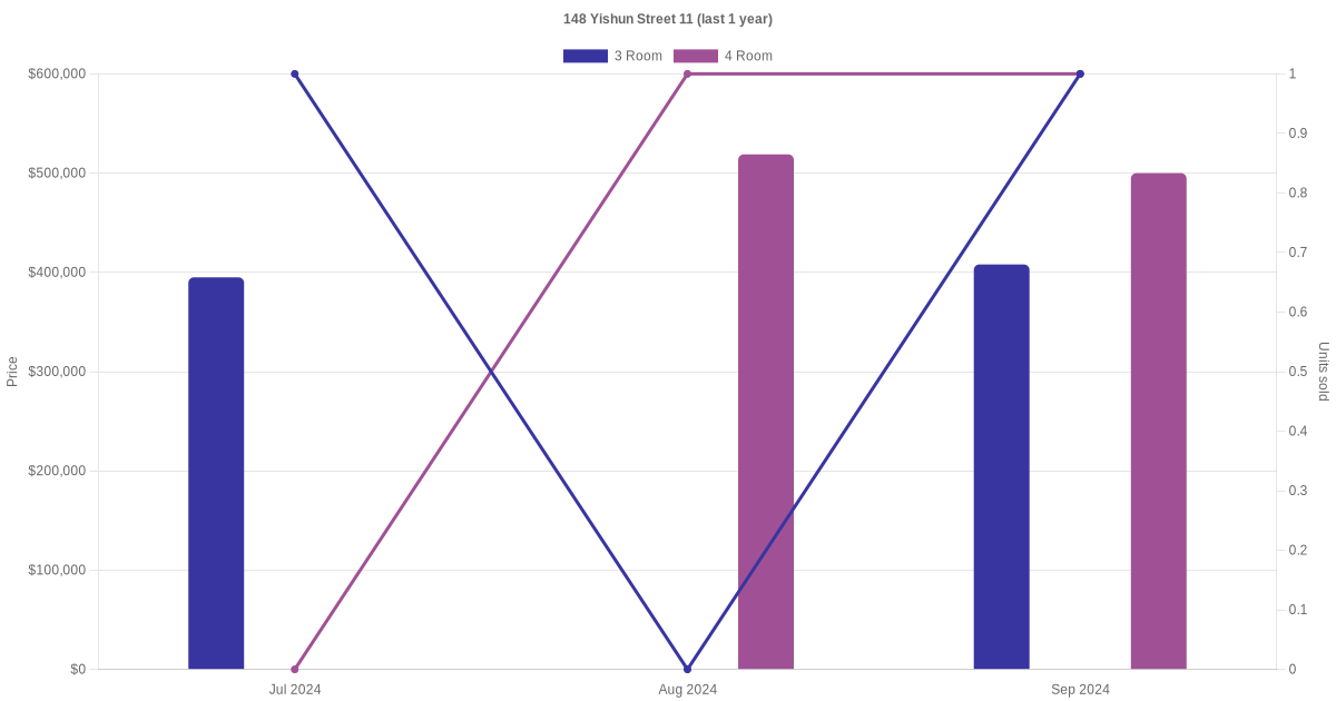 Below is a quick summary of the resale transactions volume and average price trends for the 3 room and 4 room units at 148 Yishun Street 11.