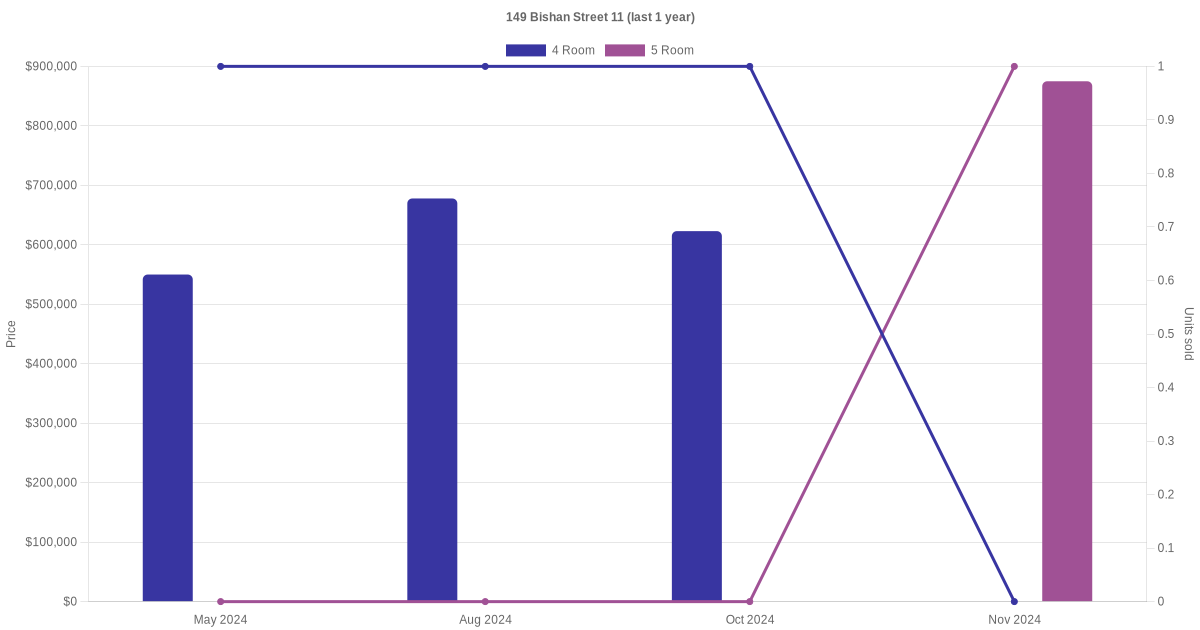 Below is a quick summary of the resale transactions volume and average price trends for the 4 room and 5 room units at 149 Bishan Street 11.