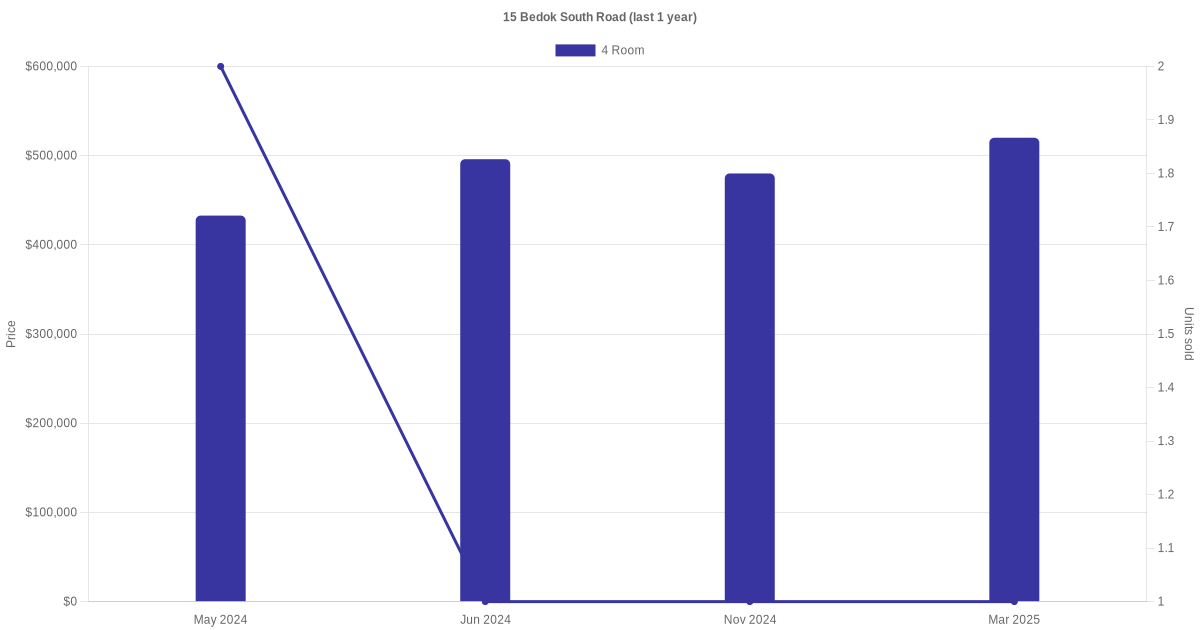 Below is a quick summary of the resale transactions volume and average price trends for the 4 room units at 15 Bedok South Road.