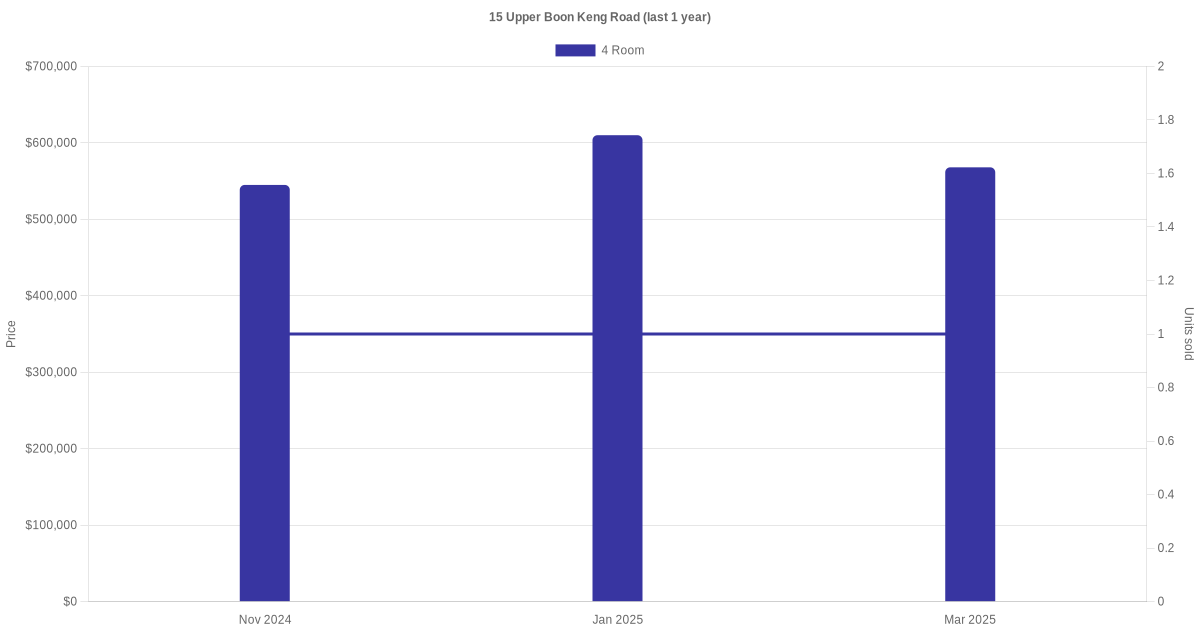 Below is a quick summary of the resale transactions volume and average price trends for the 4 room units at 15 Upper Boon Keng Road.