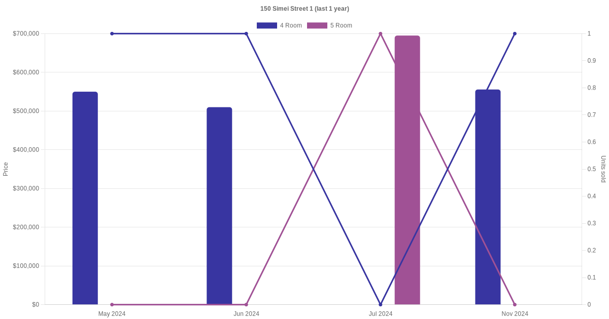 Below is a quick summary of the resale transactions volume and average price trends for the 4 room and 5 room units at 150 Simei Street 1.