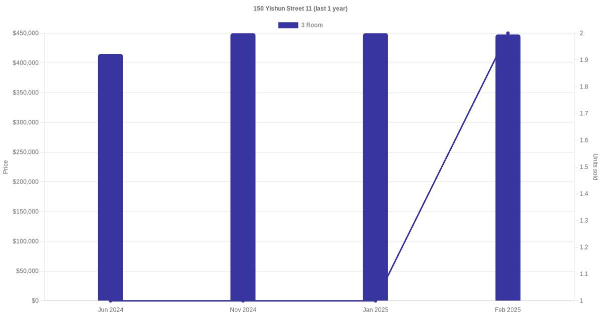 | Feb 2025 | $2,400 | 3 Room | Blk 150 Yishun Street 11 3 Room | Yishun |