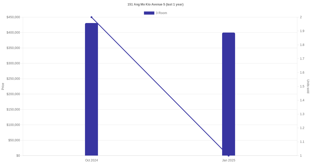 | Dec 2025 | $2,400 | 3 Room | Blk 151 Ang Mo Kio Avenue 5 3 Room | Ang Mo Kio |