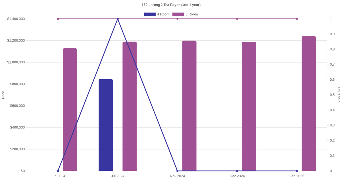 Below is a quick summary of the resale transactions volume and average price trends for the 4 room and 5 room units at 152 Lorong 2 Toa Payoh.