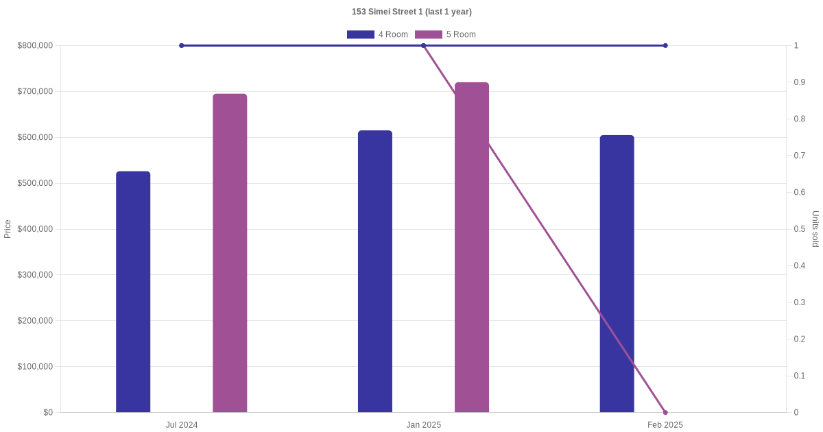 Below is a quick summary of the resale transactions volume and average price trends for the 4 room and 5 room units at 153 Simei Street 1.