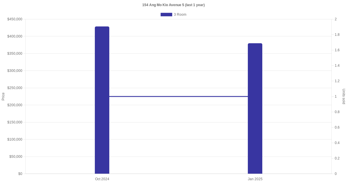 Below is a quick summary of the resale transactions volume and average price trends for the 3 room units at 154 Ang Mo Kio Avenue 5.