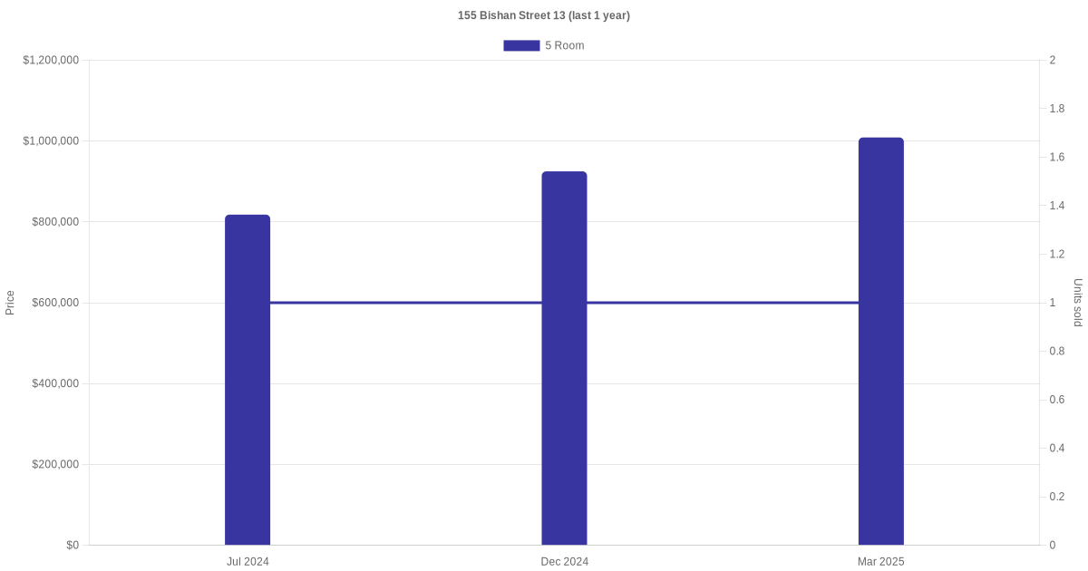 Below is a quick summary of the resale transactions volume and average price trends for the 5 room units at 155 Bishan Street 13.