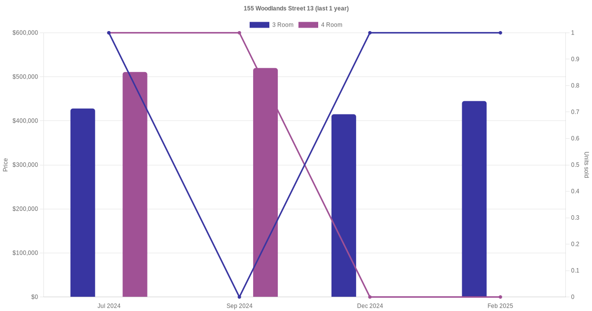 Below is a quick summary of the resale transactions volume and average price trends for the 3 room and 4 room units at 155 Woodlands Street 13.