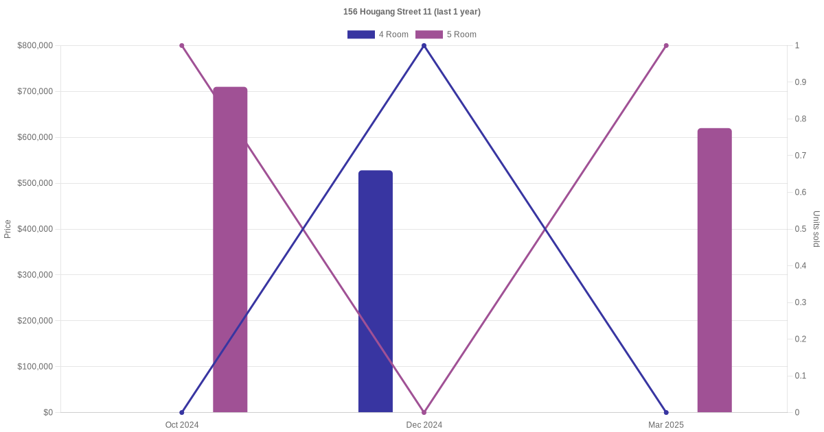 Below is a quick summary of the resale transactions volume and average price trends for the 4 room and 5 room units at 156 Hougang Street 11.