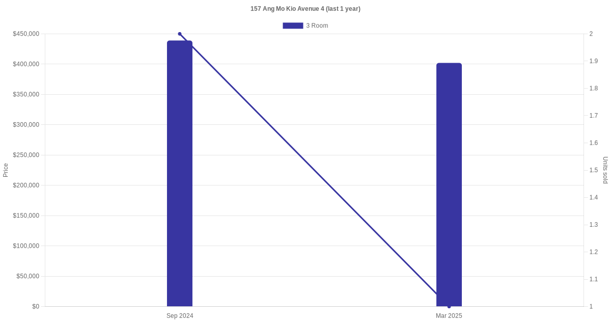 Below is a quick summary of the resale transactions volume and average price trends for the 3 room units at 157 Ang Mo Kio Avenue 4.