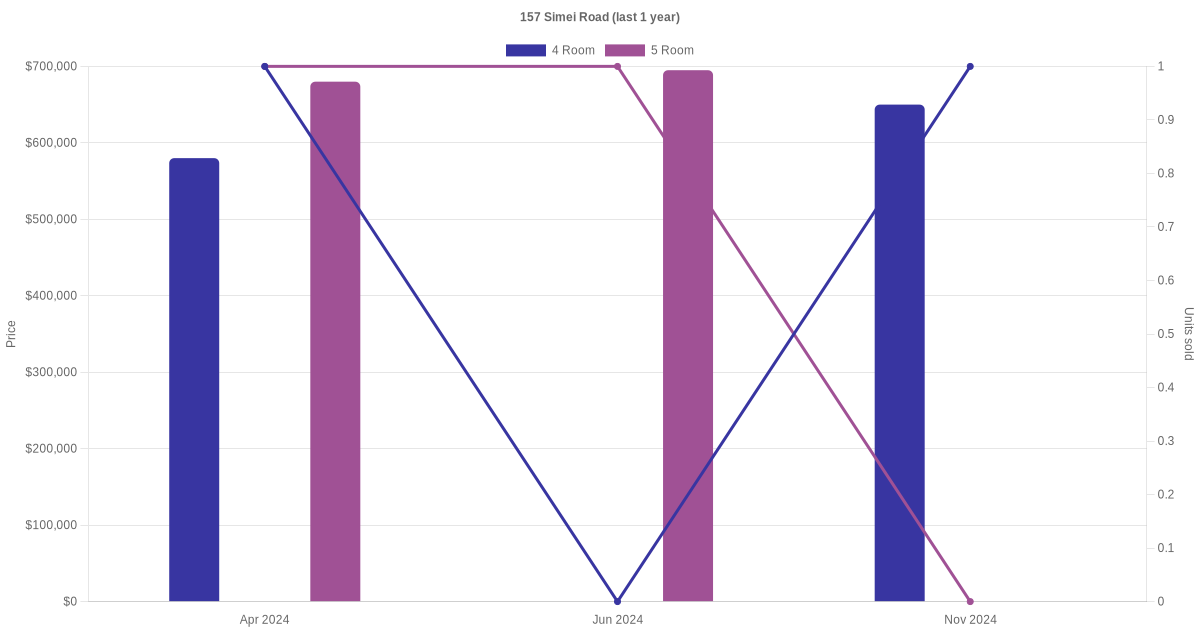 Below is a quick summary of the resale transactions volume and average price trends for the 4 room and 5 room units at 157 Simei Road.